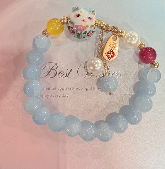 Bracciale Maneki neko Agata azzurra 8 mm