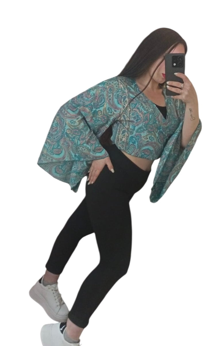 Maglietta multi funzione con maniche larghe OCEANO azzurro e oro 🪷100% Seta Made in India